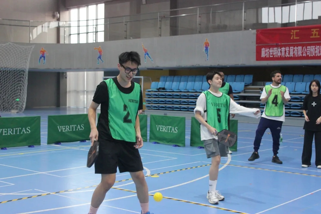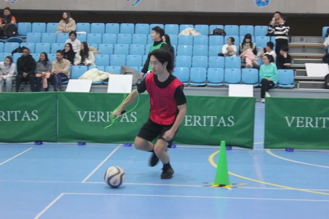 一场考验全能与默契的六项连环战!A点出发,从篮球绕杆、极速跳绳,到足球变向,选手们身手敏捷、节奏井然……但这还不是全部,最考验默契的环节来了:一人投掷匹克球,一人腰系接球框,仅凭腰腹转动完成接球;一路颠球前行,球落何处,便从何处重新出发;最后选手在旋转五圈后,顶着晕眩冲向终点。最终,用时最短的队伍获胜。但比成绩更珍贵的,是每一次完美的交接、每一句“没事慢慢来”、每一个冲刺后的击掌与拥抱。
