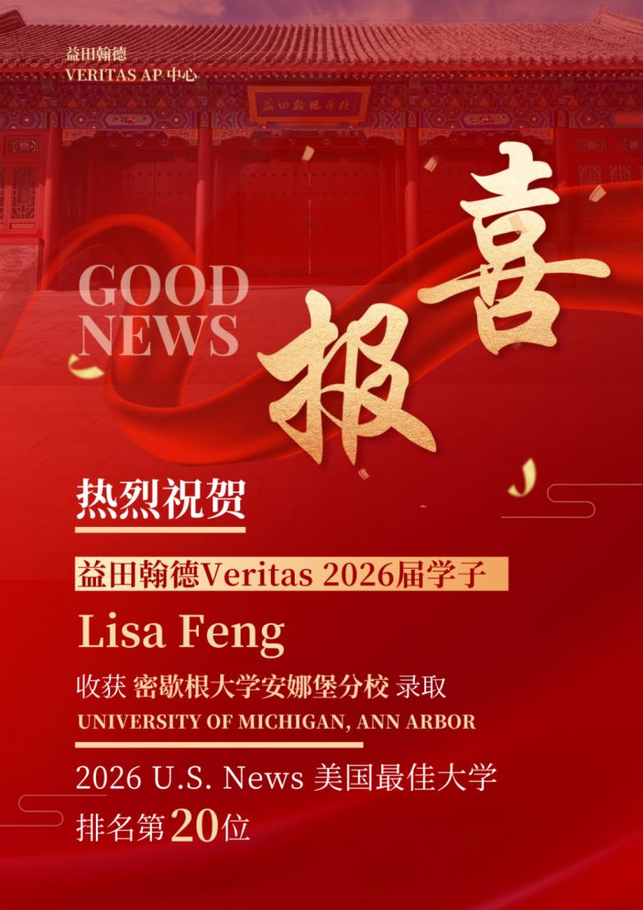 密歇根大学安娜堡分校,位列2026 U.S.News美国最佳大学排名第20位,与卡内基梅隆大学、圣路易斯华盛顿大学等并列,稳居美国公立大学前三,是“公立常春藤”核心成员。学校工程、商科、医学、公共卫生等超70%专业位列全美前十,科研实力与产业资源双强。作为美国最难申请的公立旗舰校之一,录取竞争同样激烈,Lisa同学一举拿下两大 Top20名校offer,充分展现了Veritas学子的顶尖学术实力与综合素养!