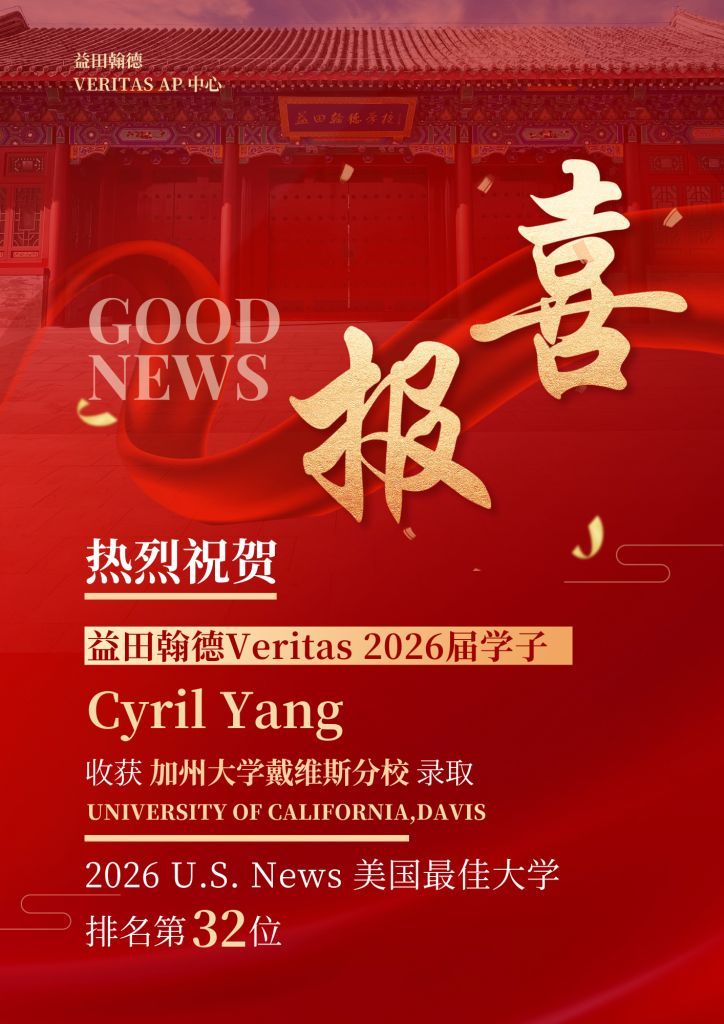2026届优秀毕业生Cyril Yang同学收获加州大学戴维斯分校录取!