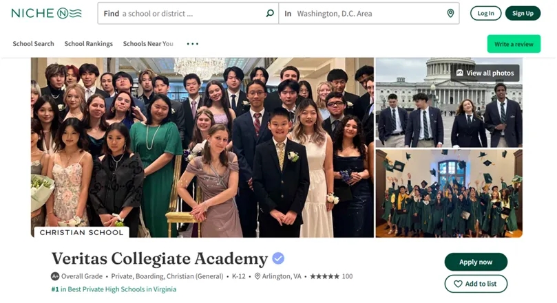 随着美国权威教育评估机构 Niche 2025最新榜单揭晓,位于弗吉尼亚州大华盛顿DC地区Arlington市的Veritas总校(Veritas Collegiate Academy) 以卓越的办学实力再创历史佳绩,荣登Niche 2025榜单弗吉尼亚州最佳私立高中第一名,最佳K-12学校排名第一,并且在华盛顿特区范围内地区多项评比中稳居榜首。这一历史性的成就标志着Veritas学校在学术质量、学生发展和大学升学成果等方面的综合实力,得到了美国教育界的广泛认可。