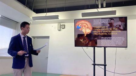 本期学生演讲主题为“同理心”,G9王子毅同学以共情为桥,告诉我们:用温柔的姿态,接住身边的每一个人。演讲开篇,王同学提出一连串疑问:同理心是否是人类特有的?是与生俱来的天性,还是后天习得的能力?如果是先天拥有,我们是否需要刻意守护与保持?仅凭匆匆一瞥的表象,又能否判断一个人内在的同理心?带着这些追问,王同学展开了他的分享。其一,同理心并非人类专属,许多动物也同样具备,这源于基因中对同类的关怀;其二,人类大脑的复杂结构为同理心的产生提供了生理基础,但这份能力的成长与成熟,更离不开后天环境的作用,如家庭的引导、自我的察觉等。王同学用自己的方式,向我们传递同理心的内涵,为我们带来一场娓娓道来的心灵启迪。