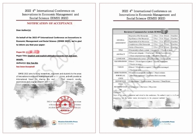 恭喜G10优秀学子Eric Yan在哈佛大学导师的带领下完成12周“对不同经济阶层的多种族的社会偏见研究”(Diverse races having social preference involved with social economic status),论文成功被“2022国际经济管理及人文科学会议”(IEMSS 2022)收录发表!